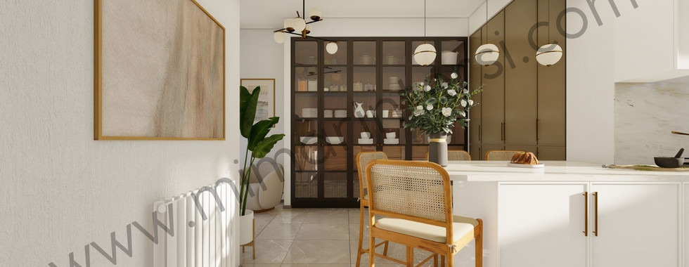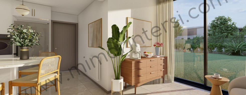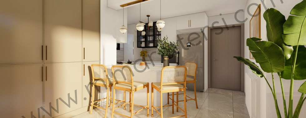 Pencerenin olduğu tarafa ise bir kahve köşesi ekleyecektik. Dışarıda bir teras olduğundan orada yemek masası duracaktı (ev sahibinin verdiği ön bilgi). Kalabalık bir görüntü olmaması için içeride yemek masası tercih etmeyecektik. Oturma alanını adada çözecektik.